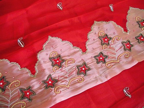 Here is vibrant & stunning work of craftsmanship that combines exquisite shimmering Red Organza Tissue Sheer fabric with gorgeous real brass bead work and sequin work to create a lovely pair of drapes / curtains. Each panel of this glittering & sparkling shimmering Red pair is 90"L X 40"W with 4" tabs for rod pocket. The highlight of the pair is the 11" bead and sequin work border along the bottom! Bead work, embroidery and gold sequin work on tissue Organza create a stunning effect. Add an airy & delicate feel to your room with this pair of Organza lightweight Sheer curtains. The fabric offers a perfect combination of privacy as well as filtered sunlight and ventilation.The sparkling embellishments will lend a spectacularly ethnic look and add style to your room. Go for a dramatic makeover of your windows and this pair would become a conversational piece of art. You'll have to just stare at this dramatic piece for hours to believe the unbelievable!A must have in any season for all ethnic savvy ones. This is a rare beauty not to be missed, a genuine collector's item & the result of masterly workmanship.Don't miss this great deal. Guaranteed you'll love it or your money back!