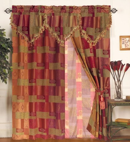 This is the matching curtain set for our Moroccan comforter set. The lavish patchwork jacquard is abundantly rich in style, color and fabrication. The curtain panels and attached valance feature an impressive combination of paisley, damask, diamond, and lattice motifs woven with chenille and metallic yarns in a warm, spice-toned color palette. (burgundy, brown, sage, purple).