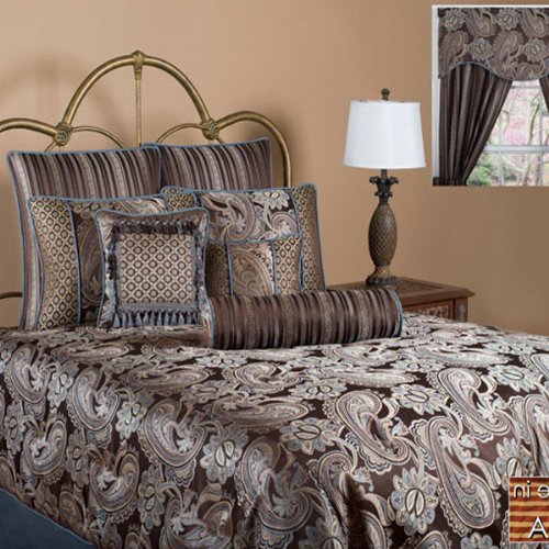 Would you like to give your bedroom traditional charm combined with a touch of sophistication? Then, you need the Nicole Paisley Brown Bedding By Victor Mill. This great comforter and accessories set features a paisley print over a chocolate brown background. The comforter is the centerpiece of the set, and it has a blue and tan paisley design that swirls over a sophisticated chocolate brown background. The Euro shams combine the same colors as the comforter, but on these shams, the colors are arranged in a striped pattern that creates a delightful contrast to the rest of the set. The standard shams feature a paisley center that is flanked by coordinating geometric designs on either side. The accent pillows feature striped, lattice and paisley prints that when placed together create a look that is very appealing. Each accent pillow has its own unique design, and each design is sure to delight you. The neck roll, for instance, echoes the stripes of the Euro sham, but the end of each roll is the same paisley print of the comforter. One of the accent pillows even combines a series of delicately attached tassels. If you are craving sophistication, this bedding set is the one for you. Twin 7 piece comforter set includes: Comforter, Bedskirt, 1 Standard Sham, 1 Euro Sham, and 3 Decorative Pillows. Full, Queen 9 piece comforter set includes: Comforter, Bedskirt, 2 Standard Shams, 2 Euro Shams, and 3 Decorative Pillows. King, Cal King 10 piece comforter set includes: Comforter, Bedskirt, 2 King Shams, 3 Euro Shams, and 3 Decorative Pillows. Twin 3 piece comforter set includes: Comforter, Bedskirt, and Standard Sham. Full, Queen 4 piece comforter set includes: Comforter, Bedskirt, and 2 Standard Shams. King, Cal King 4 piece comforter set includes: Comforter, Bedskirt, and 2 King Shams. Twin- 71x96", Full- 86x96", Queen- 92x96", King/Cal-King-110x96". Size = Twin, Full, Queen, King, Cal King Color = Brown, Blue, Tan